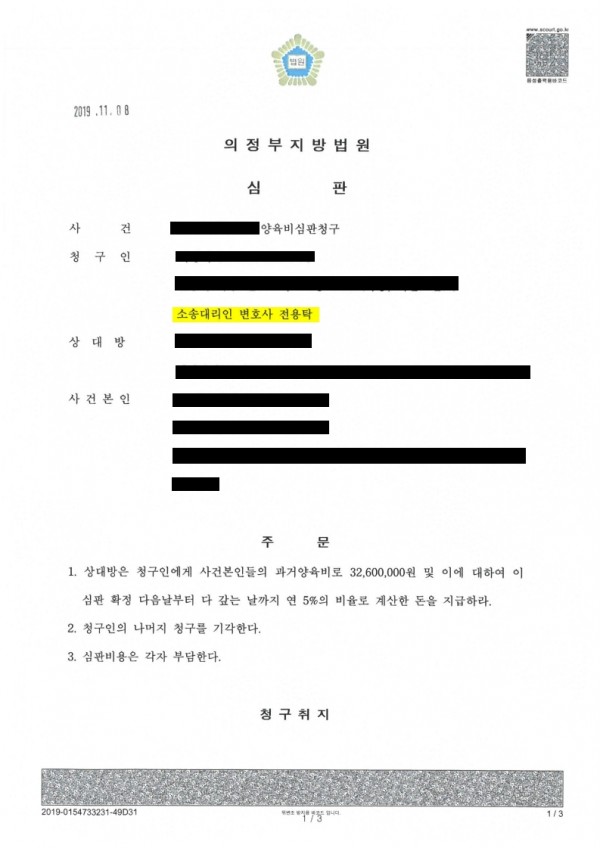 과정 : 법률사무소 그날에서는 1) B가 A에게 지급한 양육비 내역을 정리하고, 2) 미지급양육비가 약 3,000만 원에 달하는 점을 주장, 입증하였음