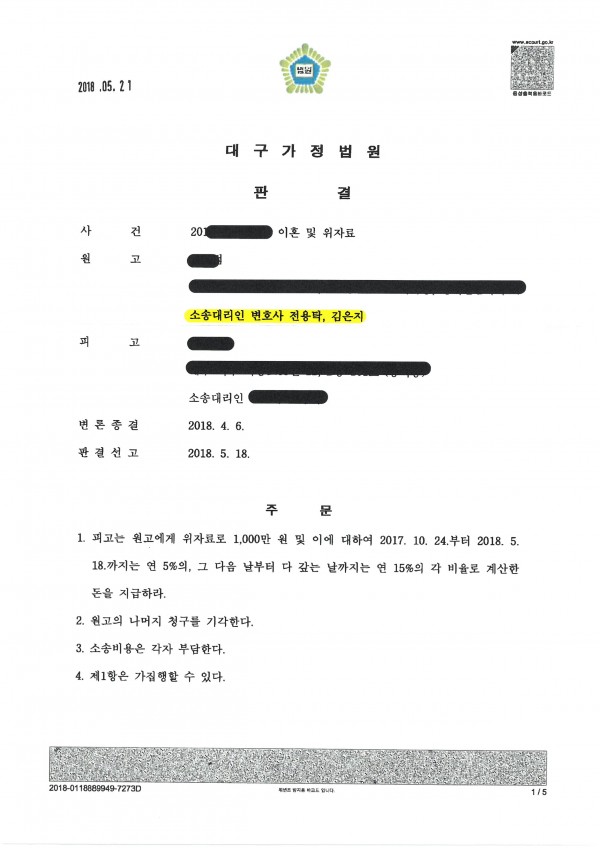 결과 : 재판부에서 피고의 부정행위를 인정하여 위자료로 1,000만 원을 지급하라는 판결을 내림.