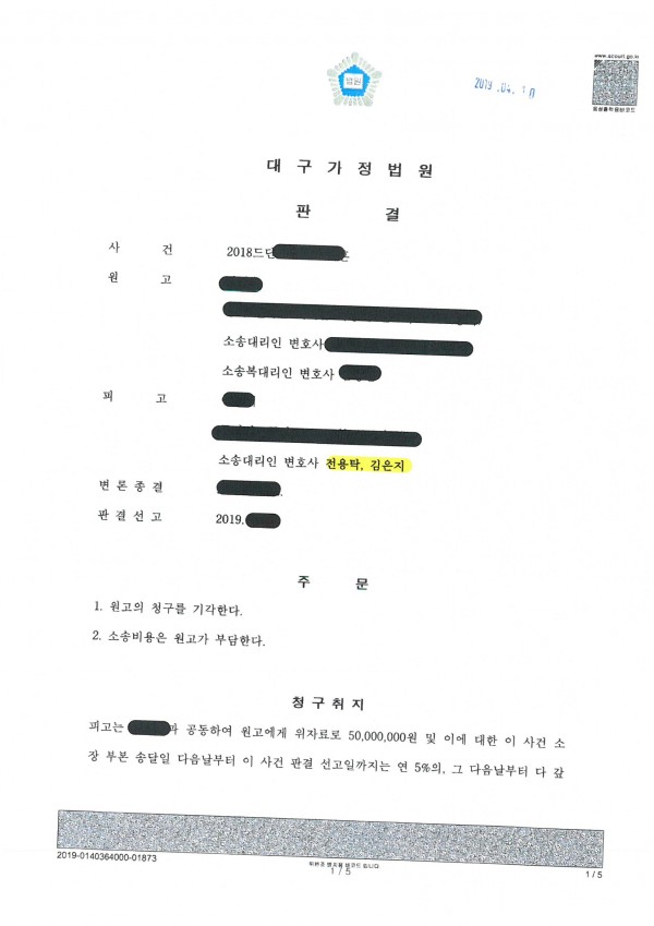 개요 : 의뢰인A는 같은 회사에 다니는 B가 유부녀인 사실을 모르고 연인사이로 발전하게 되었는데, B의 배우자라고 주장하는 C로부터 고액의 합의금을 제시하는 내용의 연락을 받게 되었고, 이를 거부하자 부정행위를 사유로 이혼사건의 피고2의 지위로 위자료 5,000만원을 지급하라는 내용의 소송에 휘말리게 되어, 즉시 법률사무소 그날을 방문하게 되었습니다.