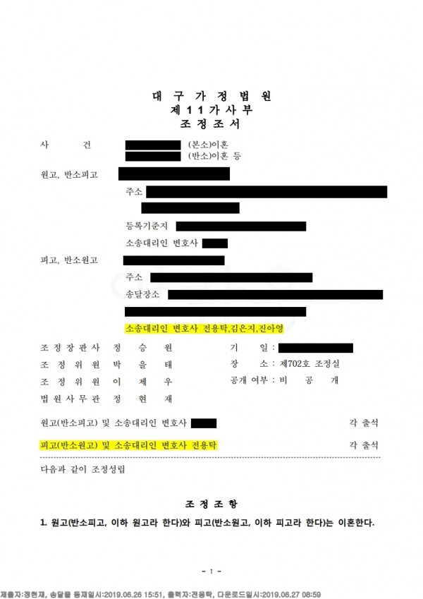 결과 : 재판부에서는 법률사무소 그날의 주장을 받아들여 상대방B가 청구한 위자료를 인정하지 않았고 오히려 B가 의뢰인A에게 재산분할로 9천만원을 지급하라는 내용으로 조정이 성립되었음.