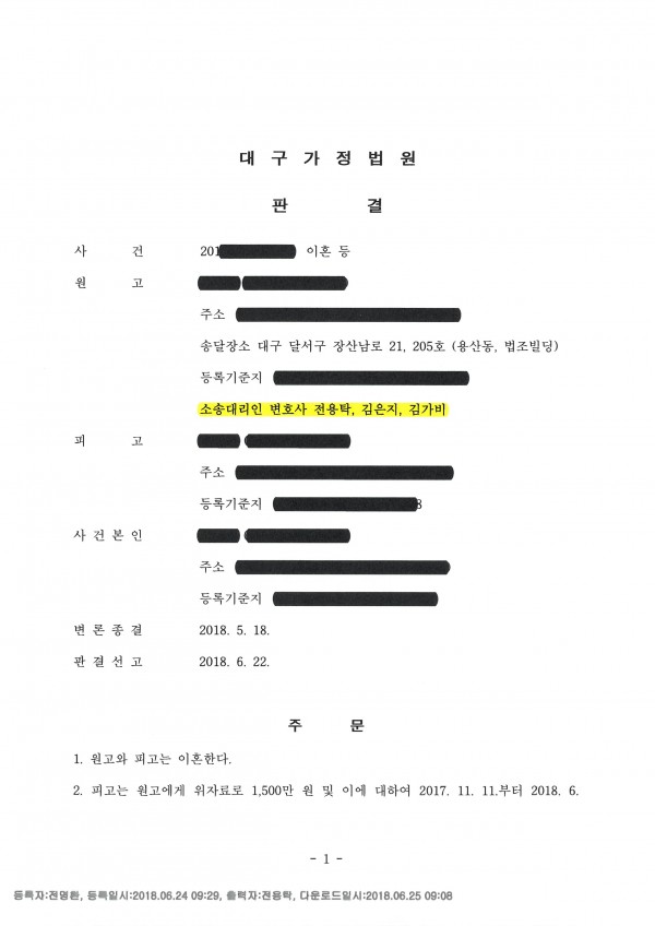 1) 남편 B와 다른 여성 사이의 부정행위를 인정하여 남편 B가 의뢰인 A에게 위자료로 1500만원을 지급하라고 판단함.