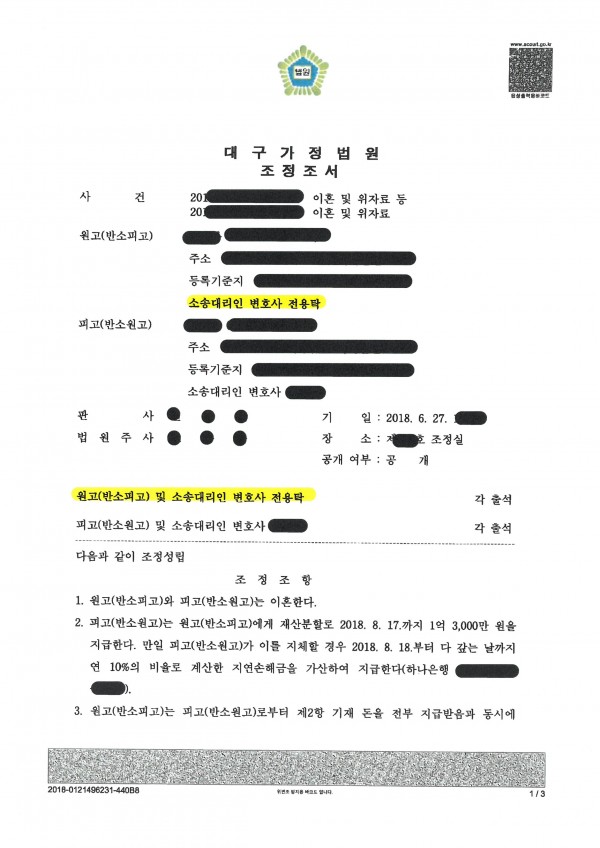 2) 기여도 또한 50%로 인정하여 B가 A에게 재산분할로 1억 3,000만 원을 지급하라는 조정이 성립되었음.