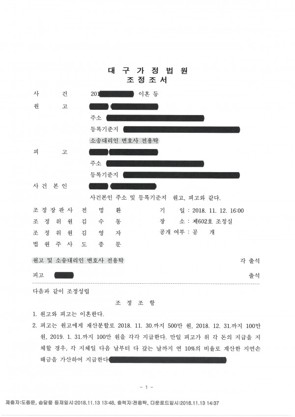 그리고 의뢰인 A가 재산형성 기여도가 상당하므로 남편 B로부터 재산분할을 하는 것으로 조정 성립함.